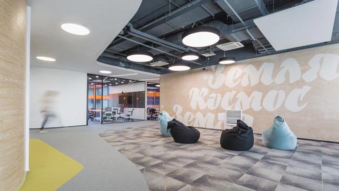 過道結合部的設計:此處為整個企業的內部交匯點,在此處過道呈四面八方式分布,不管走哪一個方向都可以繞回原地,這也是一個大回型動線設計,故此設計師在設計中在此地開辟出一片如凈土般的區域,以軟裝進行鋪墊,讓員工、客戶在此處可以休息、娛樂,可增可減的沙包型座椅,也在無形中成為一處亮點。