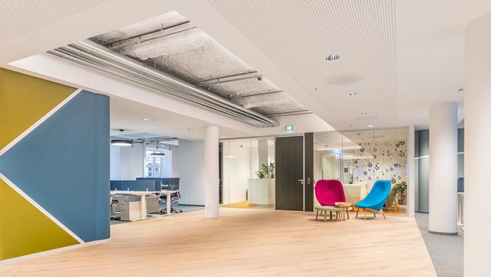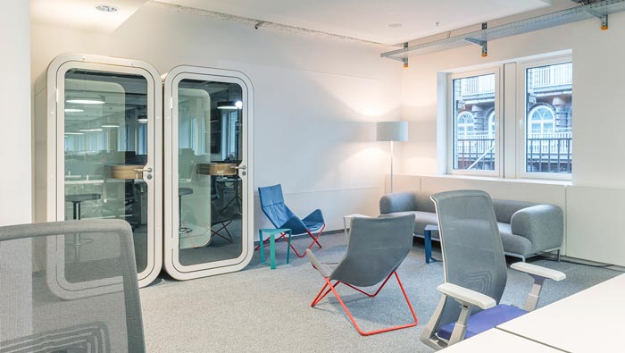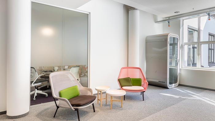 交流區(qū)域的設(shè)計(jì):設(shè)計(jì)師利用半圓的相對(duì)獨(dú)立性,打造了一個(gè)一個(gè)的半圓形交流空間,每一個(gè)空間雖然相對(duì)獨(dú)立,但是整體上又互為整體,設(shè)計(jì)師用形狀的天然屬性做為設(shè)計(jì)依據(jù),目的就是在設(shè)計(jì)與空間之間取得一個(gè)平衡,在滿足企業(yè)需求的同時(shí),不會(huì)對(duì)整個(gè)空間造成影響。