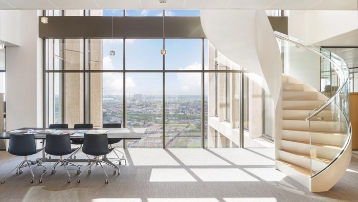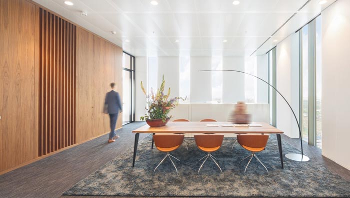 小型會議室的設計:在我們的想法之中,會議室一般都是封閉式的,但是設計師在此處偏偏采用了開放式,這是因為設計師希望通過空間來化解人與人之間的壓力,并通過美景來沖散心中淤積的心事,在這樣的空間中,人的思路會越來越清晰。