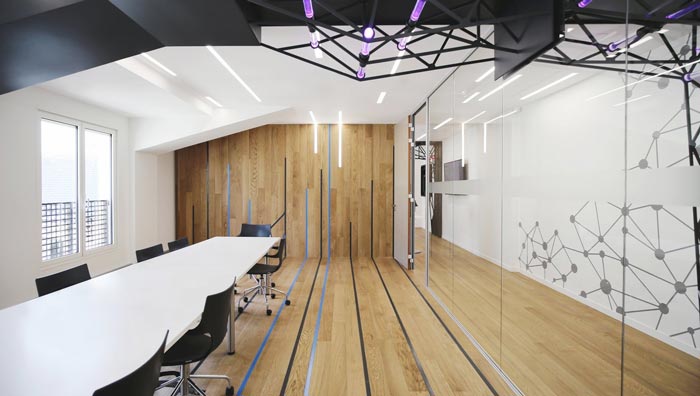 會(huì)議室的設(shè)計(jì):此處采用的是加長版的會(huì)議桌,相信大家想起會(huì)議都會(huì)感覺十分枯燥,設(shè)計(jì)師也注意到這個(gè)問題,故此在設(shè)計(jì)中盡量減少多余的元素,將一切都融入于無形,木板之間的間距、射線在陽光的照射下,好似那突破突破壁障的一絲絲零星想法。