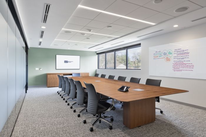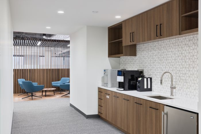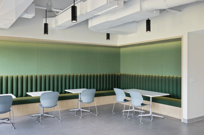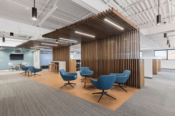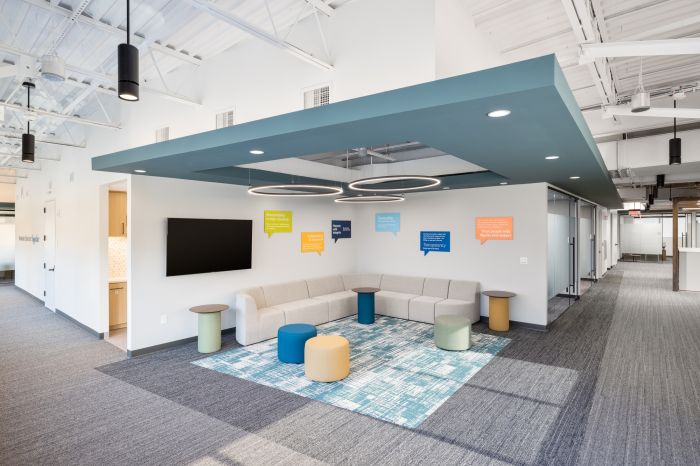 設(shè)計優(yōu)化了整體空間,以兩個開放式樓梯為中心。第二層側(cè)重于工作空間,第一層主要以公共空間為主,設(shè)計師提供了協(xié)作解決方案,其中包括一個帶有可移動隔板的培訓(xùn)室和休息室。這個空間可以讓全國的團(tuán)隊進(jìn)行培訓(xùn)活動。