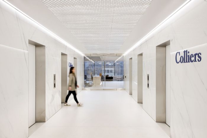 這是一個5500方的辦公室,整體空間寬敞明亮。整個空間設計都凸出體現了公司的品牌,同時還采用了極簡主義的色調和紋理。大理石面板從電梯大廳一直延伸到白色、淺灰色和藍色的輕盈背景中。