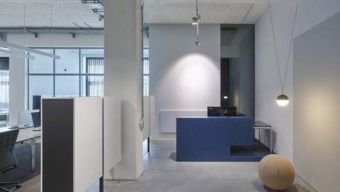 前臺的設計:此處與辦公區域相鄰,但是又是兩個不同的功能區域,設計師為了有效的加以區分,同時不破壞整個空間的通透性,故此設計師在辦公區域的周邊,形成一個以儲藏柜為隔離帶的設計,這樣設計的好處就是即隔離了空間,又增加了新的功能區域。