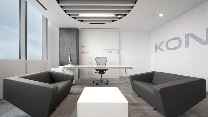 進(jìn)門區(qū)域的設(shè)計(jì):設(shè)計(jì)師在設(shè)計(jì)的時(shí)候,結(jié)合空間的實(shí)際情況,最后決定采用去前臺(tái)的設(shè)計(jì)手法,這樣一來一方面可以進(jìn)一步深化辦公流程,另一方面也可以彌補(bǔ)空間的不足,流線型的白色造型加上白色logo墻與彩色logo,也為企業(yè)帶來了一絲靈動(dòng)或活力。
