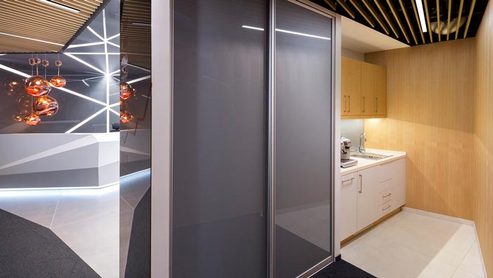 獨(dú)立茶水區(qū)的設(shè)計(jì):此處位置的設(shè)計(jì)十分巧妙,設(shè)計(jì)師將其安置在接待區(qū)域與辦公區(qū)域之間,這樣做的好處就是一方面可以供接待客戶之用,另一方面可以方便內(nèi)部員工使用,這樣設(shè)計(jì)的好處就是無(wú)形中加快辦公的效率,同時(shí)將此處空間合理的加以利用,以此增加空間的多元化,設(shè)計(jì)師的目的就是讓辦公更加方便。