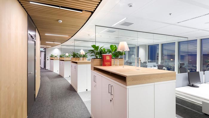 獨(dú)立辦公區(qū)域的設(shè)計(jì):此處就是一個(gè)個(gè)獨(dú)立的辦公空間,通過上圖可以明顯看出,區(qū)域與區(qū)域之間有隔斷墻隔離開,這樣做的目的旨在盡量減少開放式辦公室工作的不適,從而在各個(gè)部門之間配備玻璃隔斷物,這樣可以既不會(huì)破壞整體的設(shè)計(jì),同時(shí)也可以形成一個(gè)個(gè)獨(dú)立的辦公空間,真是一舉幾得。