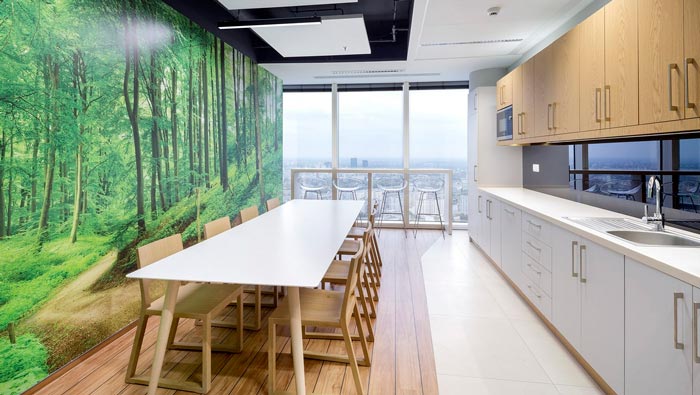 茶水間的設(shè)計(jì):此處位于一個(gè)獨(dú)立的空間之中,與休息空間相互結(jié)合在一起,設(shè)計(jì)師這樣做的目的,就是希望給員工打造一個(gè)減壓的空間,在這里員工可以遠(yuǎn)離辦公帶來(lái)的壓力,帶來(lái)暫時(shí)的緩解,在這里員工可以相互交流、相互攀談,在這里看看風(fēng)景也不失為一個(gè)好的主意,設(shè)計(jì)師要做的就是讓員工在這里可以忘卻煩惱。