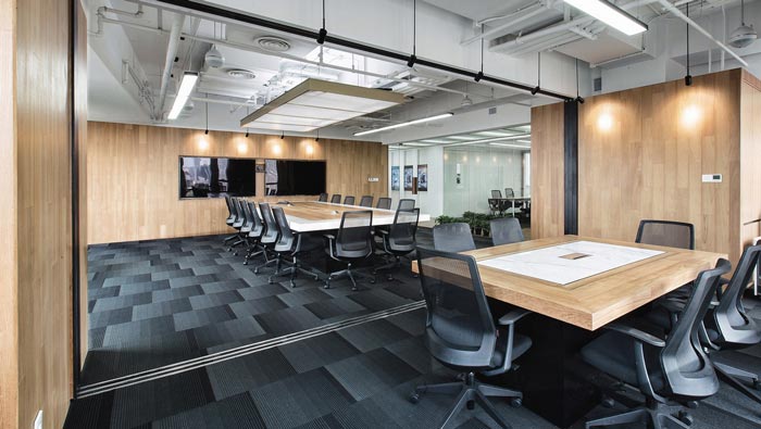 會議室的設計:設計師在設計的時候,打算設計一個小會議室與小會議室結合的會議空間,大會議室安置在空間的內部,小會議室安置在空間的外側,兩者之間呈一條直線分布,這樣布局的好處就是為空間預留了足夠的活動空間,活動空間與動線相互結合在一起,既保證了空間的通暢又保證了空間的正常運行。