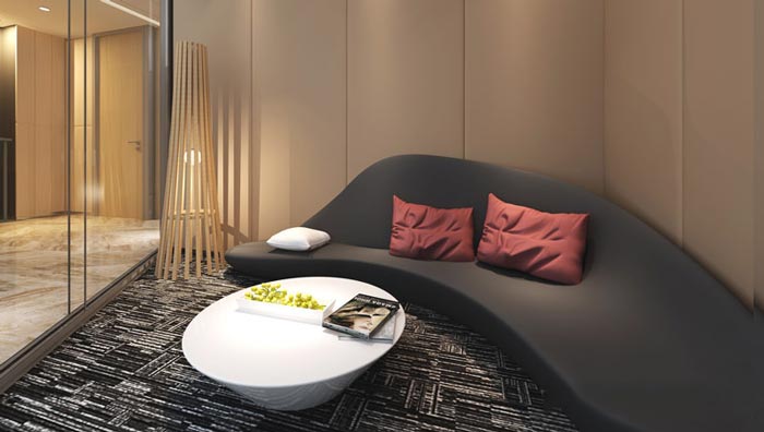 接待區域的設計:在設計中不是每一個空間都是完美的,就像此處空間本身就是一個菱形,這也就為設計增加了難度,設計師首先用木飾面對墻體進行裝飾,打消空間的棱角,其次就是定制的弧形接待沙發,不管是擺放位置還是其本身的形態,都有效的化解了空間本身的缺憾,讓空間趨于完美。
