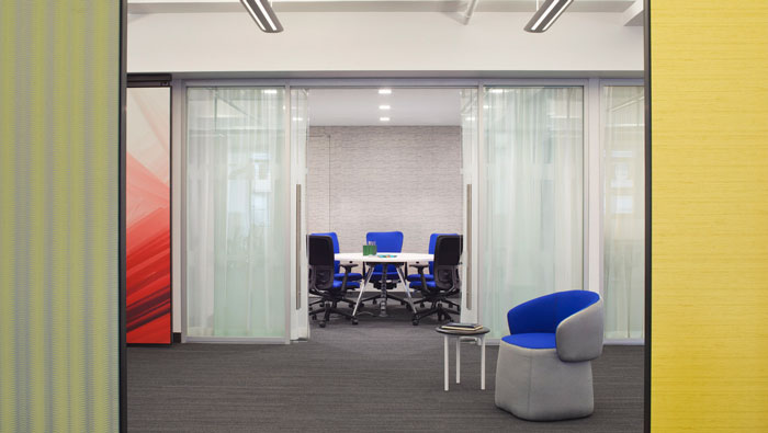 辦公區域的設計:懸掛的隔斷如一扇扇門將辦公區域擋在視線之外,但懸掛的隔斷不是死的而是靈活的,一扇扇可拉可合,開放的辦公區加上半封閉的個人辦公區,兩者之間形成一個很好的結合,這樣的設計旨在消除弊端,同時也在為企業營造利于發展的辦公新格局。