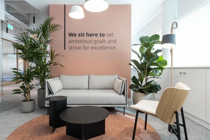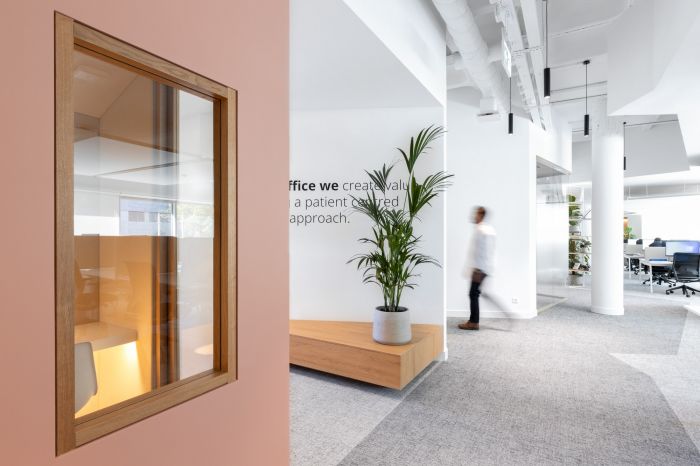 這是一個700方的辦公室,業主是一家從事醫藥行業的公司。設計師把工作區分為三個區域:一個安靜的區域,員工可以進行個人工作;一個動態區域,員工可以單獨工作或者與同事互動;以及一個協作區域,團隊可以在這里進行會議,進行團隊討論。