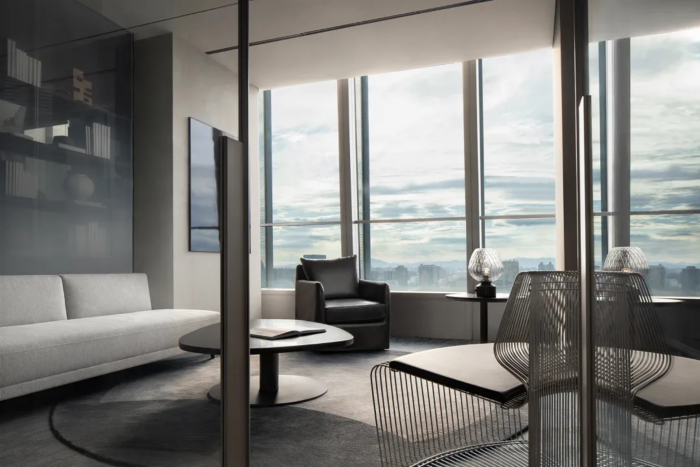 這間辦公室擁有500方的面積,業主是一家享譽業界的金融公司。設計師使用新中式的風格,展現了東方的視野,設計始終保有空間的溫和與優雅。雕塑化的造型、理性的結構美、簡 雅的線條感,極簡的空靈和厚重的現實得以結合。