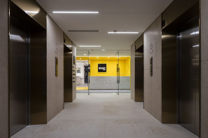 設(shè)計(jì)師將公共空間如接待處、服務(wù)臺(tái)、大廳廊道和文印室統(tǒng)統(tǒng)歸攏到一個(gè)稱為“核心”的中央空間。工作區(qū)圍繞這處核心空間展開(kāi),引導(dǎo)人們的視線都集中朝向核心區(qū)。這種向心點(diǎn)的設(shè)計(jì)手法目的是體現(xiàn)公司的協(xié)作京生。