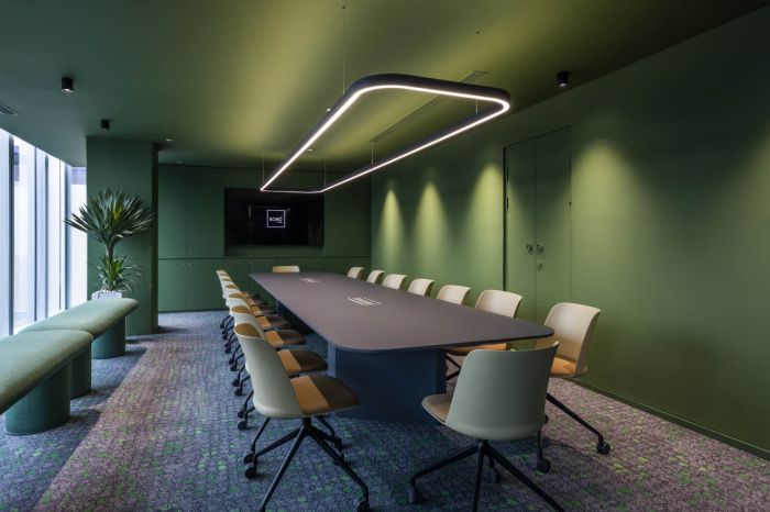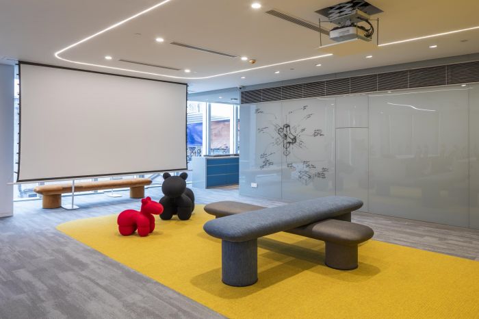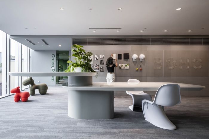 他們?cè)噲D打造一個(gè)能展現(xiàn)企業(yè)文化并能激發(fā)團(tuán)隊(duì)熱情的辦公場(chǎng)所。所以空間減少了實(shí)體隔墻,以展現(xiàn)開(kāi)放的辦公文化。運(yùn)用塊面色彩、幾何形式、通透的玻璃隔墻去界定各功能區(qū)域,形成沒(méi)有視覺(jué)阻隔的開(kāi)敞空間感。這樣的設(shè)計(jì)也正好契合公司致力于互動(dòng)與協(xié)作的工作精神。
