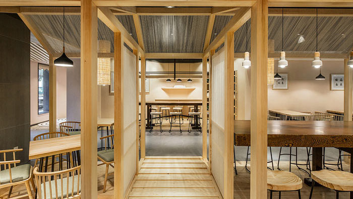 特色面館中間區域設計:中間區域由木制的框架構成,設計師在整體框架之下,又將空間分成幾個不同的區域,這樣做的目的就是希望將空間進行有效的劃分。