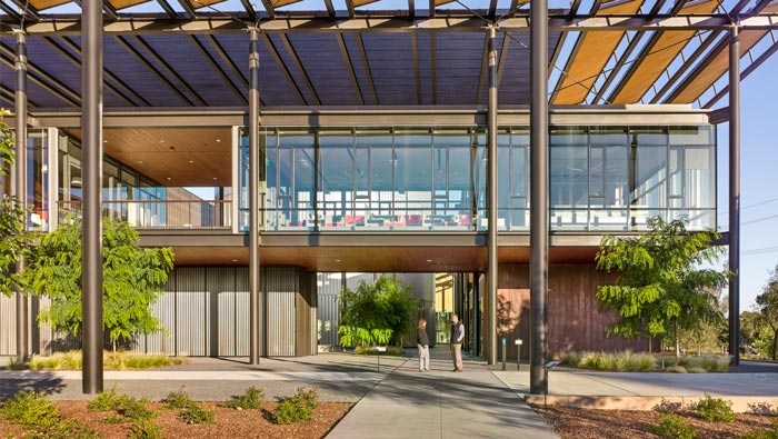 辦公樓進門區域的設計:頂部折疊的設計,可以將強光擋在遮光板之外,讓光經過阻擋后變為柔光,這樣的轉換讓人可以免受強光的照射,同時遮光板也有吸收太陽能的作用,經過專業設備的轉換,為日常照明、工作提供了免費的電源,設計與設計之間環環相扣,讓廠房自身的節能趨于完美。