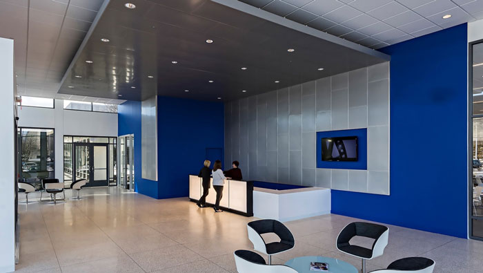 汽車工廠前臺(tái)裝修設(shè)計(jì):這里融合了前臺(tái)區(qū)、接待區(qū),前臺(tái)主要用來接待,接待區(qū)主要用來休息,待人接物是設(shè)計(jì)師首先要解決的問題,這樣的空間氛圍表示著企業(yè)的理念。