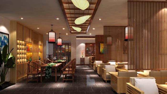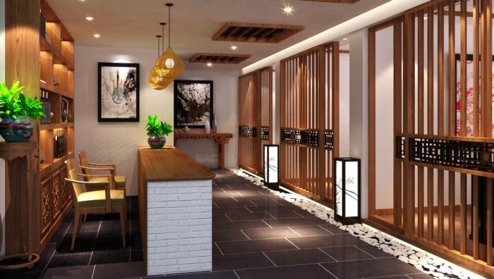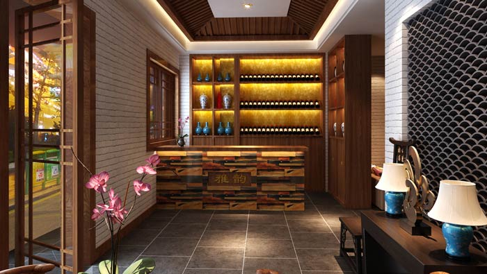 中式茶餐廳引導(dǎo)區(qū)設(shè)計(jì):此處正對(duì)包廂,讓無(wú)微不至的服務(wù)體現(xiàn)在每一個(gè)細(xì)節(jié)當(dāng)中,之所以在這里安置吧臺(tái),是避免出現(xiàn)服務(wù)死角,設(shè)計(jì)師希望讓客戶體會(huì)到無(wú)微不至的服務(wù)。