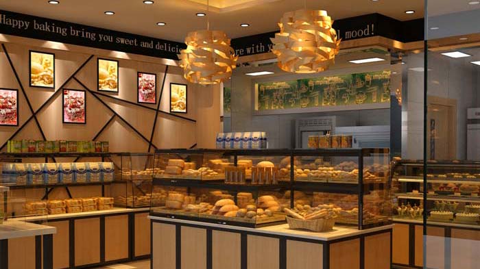 蛋糕店暖色燈光把產(chǎn)品襯托的更加新鮮,右手邊從托盤(pán)柜到面包展示平臺(tái)再到中島柜、蛋糕模型柜產(chǎn)品集中便于顧客挑選,款臺(tái)、水吧緊鄰賣場(chǎng)使結(jié)算購(gòu)買飲品更加方便。