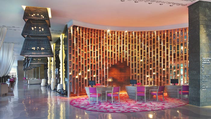 前臺的設(shè)計:當顧客進入空間之后,首先感受到的就是當?shù)氐娘L土人情,這也是設(shè)計師希望看到的場景,在設(shè)計師看來設(shè)計是要因地制宜的,在設(shè)計中設(shè)計師在當?shù)剡M行了多次的調(diào)研,目的就是要尋求當?shù)鼐哂写硇缘慕ㄖc文化,并將其縮小后融入空間之中。