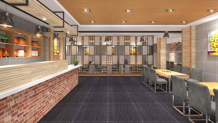本次魚火鍋店裝修設計方案講解到此結束,設計師在本次火鍋店設計中,空間地面采用黑色仿古磚,墻面采用三種色彩的材質與小紅磚,讓客戶仿佛在記憶中中老房子里就餐。