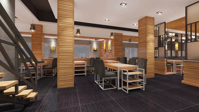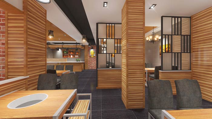 魚火鍋店一樓餐區設計:四人桌、六人桌是一樓餐區的主要組成部分,這里的設計目標十分明確,就是為每一桌的客戶,在滿足需求的同時,為他們營造一個優質的就餐環境。
