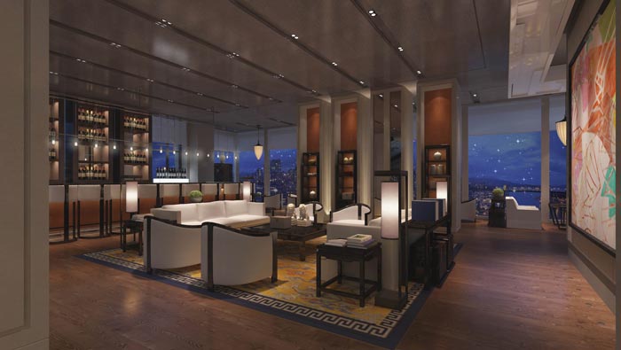 酒吧的設計:此處類似一個小型的酒吧,此處位于空間的深處,當夜幕落下之后,客戶透過落地窗看到的是美麗的夜景,設計師在設計中,重點在于強調角度的變化,在設計師看來繁星點點充滿了人對于星空的憧憬與好奇,有利于保持客戶求知的心態,故此設計師希望繁星點點的景色,可以激發客戶心中久違的斗志。