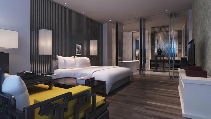 套房的設計:活動隔斷門將空間一分為二,一邊為休息區、一邊為洗浴區,客戶在洗浴區褪去一身疲憊的時候,漫步走進客房,此時活動門會慢慢的關閉,因為此活動門是可以遙控關閉的,設計師希望讓客戶在這里享受到自動化的服務,讓客戶享受到古代元素+現代元素結合的空間設計。