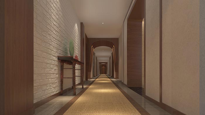 走廊的設計:經過前臺客戶通過走廊進入客房,在空間的作用上走廊起到連接兩個空間的作用,這樣的空間給了設計師很大的發揮空間,首先就是地毯的設計與選擇,土黃色的地毯與深色的外延,讓人感受到貴賓一樣的待遇,好似古代達官貴人出行紅地毯鋪路的場景,同時在空間意境的感染下,讓客戶的心得以靜下來,去聆聽空間的故事。