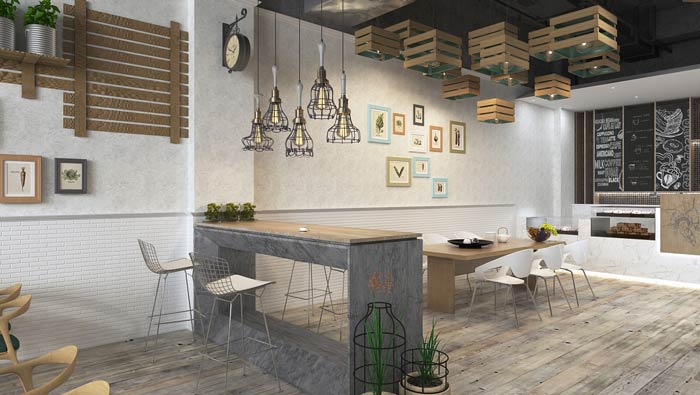 街角的咖啡店吧臺區設計:這里大致可以容納4個人,這里既是4人區,同時也是獨立區域,一個人路過這里,坐在這里喝一杯咖啡,停下來休息一下,在這里享受獨自的時光。