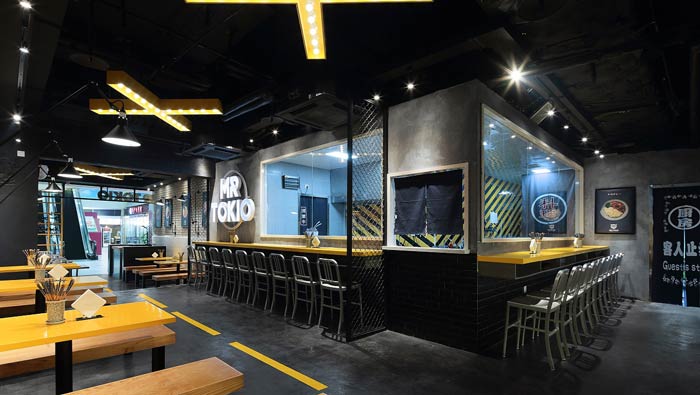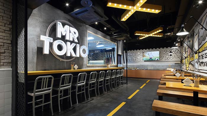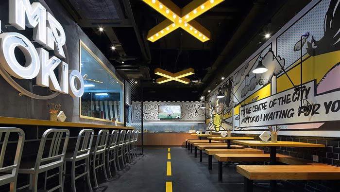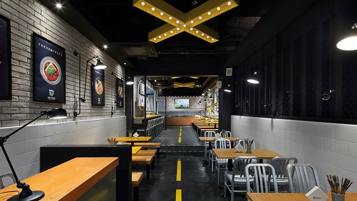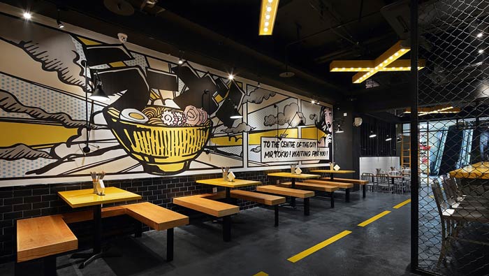 日式快餐店裝修設(shè)計:設(shè)計師采用了漫畫元素和工業(yè)感的設(shè)計,其中波普風(fēng)漫畫、美式復(fù)古霓虹燈、鋁合金壁燈、公園長凳餐桌、黑色的地鐵磚,整個融合空間讓餐廳有了自己的特色。