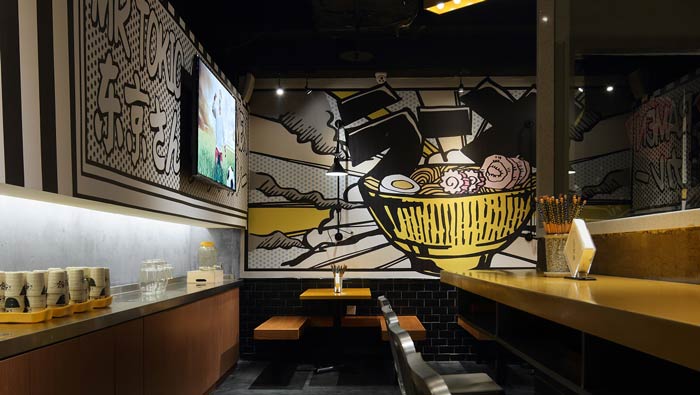 日式快餐店墻畫裝修設(shè)計:墻面大碗面讓人看了就有食欲,墻畫講述的是一個故事,故事內(nèi)容全看客戶如何理解,設(shè)計師希望打造一個有故事的快餐廳,讓快餐廳有自己的文化。