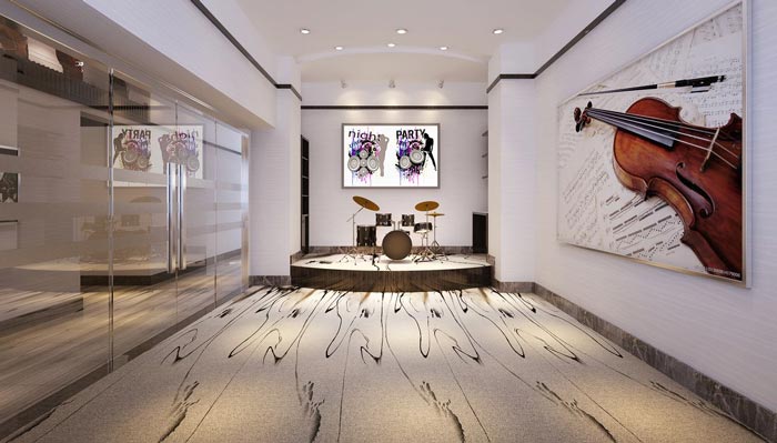 在走廊上面,設計師特意在頂部開辟了展示各種音樂器具的地方,讓客戶隨時隨地體會到音樂的氣息。