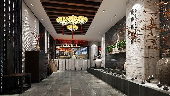 私房菜館過道設計:中式的門窗、板凳、吊頂、走廊裝飾,讓客戶仿佛置身于古代的客棧之中,這樣的空間相信很多人只是在電視劇上看到過,設計師希望客戶在這里看到實物。