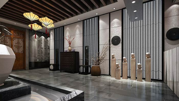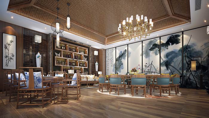 私房菜館客房設計:這里好似在山水墨畫之中,客戶在山水墨畫之中吃飯,也是一個不錯的創意,這里給人的是一種意境,讓客戶在這里感受到不同,讓客戶在這里感受到畫中的世界。