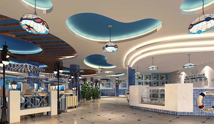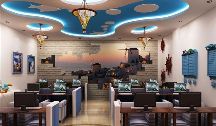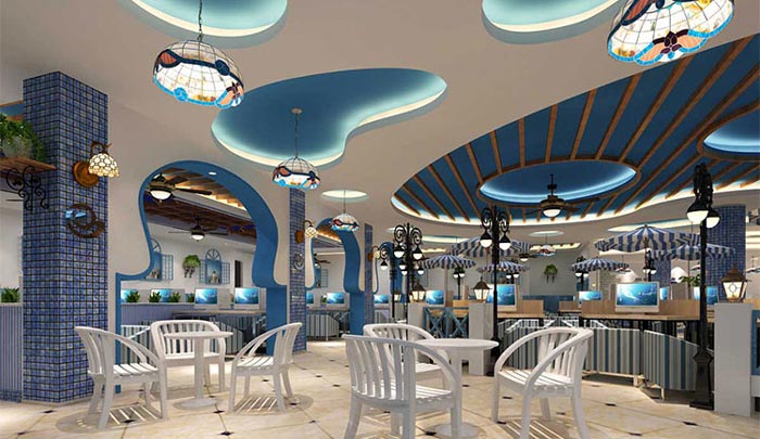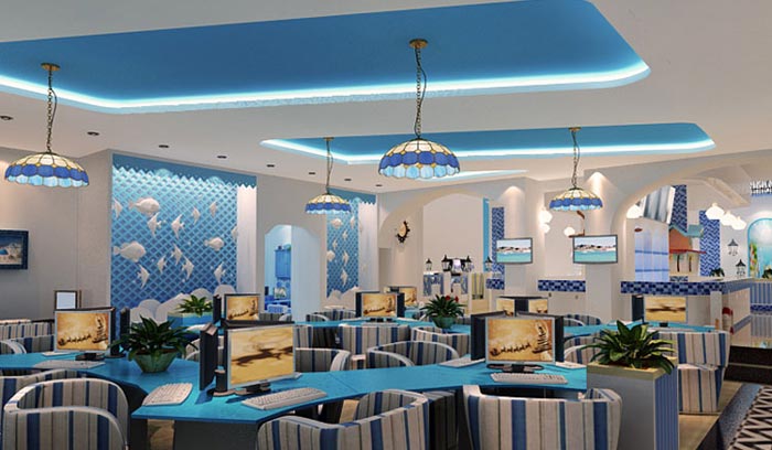 設計理念:設計師在網咖裝修設計的時候,和業主經過幾次的交談和自己的經驗,最后把設計風格定位地中海風格。
