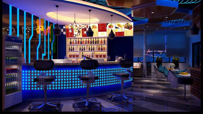 地面?zhèn)€性的地面拼花放射性的效果和吧臺(tái)融為一體,暗藍(lán)色的肌理漆,很好的鋪墊了大環(huán)境,木紋的裝飾個(gè)性爾舒適,設(shè)計(jì)的基本原則是少花錢出效果。