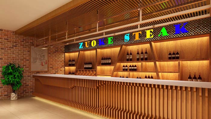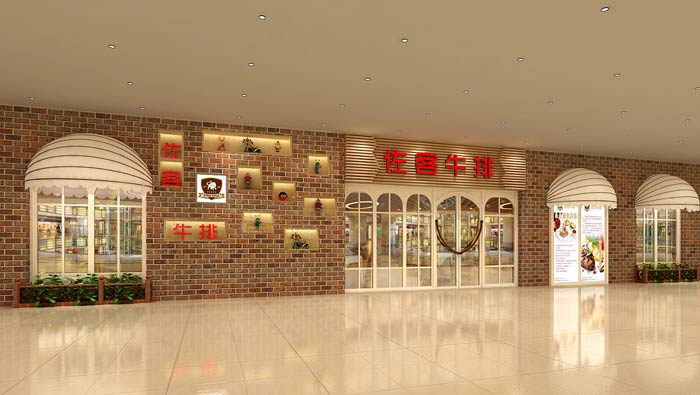 牛排西餐廳外立面裝修設(shè)計:牛排是餐廳的主打餐品,故此設(shè)計師在設(shè)計中,將牛排二字特意提出,目的就是在于強調(diào)餐廳的屬性,讓客戶知道這里的餐品是什么,而不是一概而論。