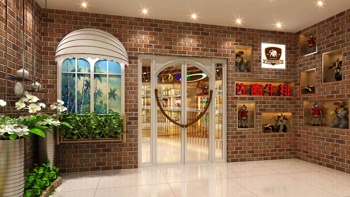 牛排西餐廳進門區(qū)裝修設(shè)計:從室外往室內(nèi)看去,發(fā)現(xiàn)室內(nèi)好像隱藏了一座海島,讓客戶對內(nèi)部充滿好奇,海島的風景讓這里充滿了自然的風情,讓客戶在這里感受到生活的美好。