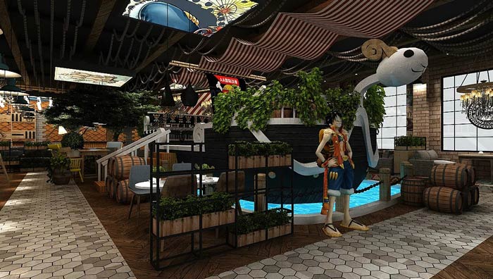 主題餐廳海盜船設(shè)計(jì):船體漂浮在水面上,客戶在來回晃蕩的船體上就餐,讓客戶感受到在區(qū)別于陸地的感覺,空間的裝飾讓人感覺,好似回到了海賊王時(shí)代。