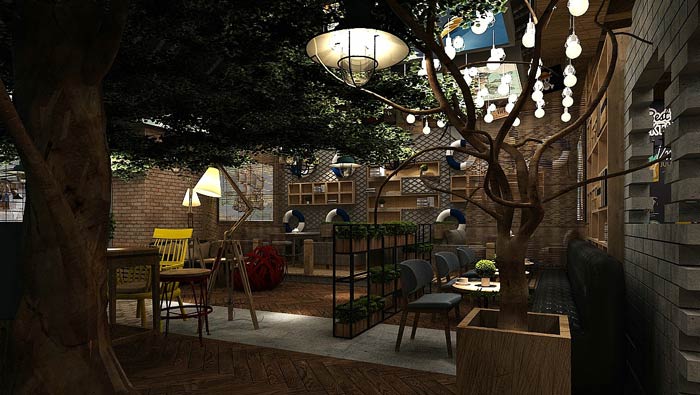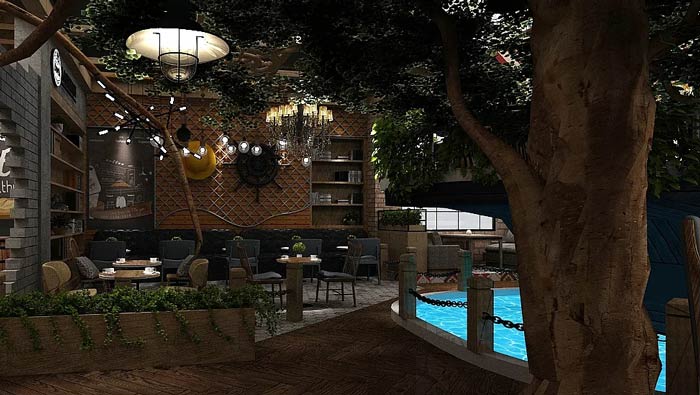 主題餐廳餐區(qū)設(shè)計(jì):餐區(qū)圍繞水池分布,水池旁邊有樹、綠植,因?yàn)橛兴钥臻g空氣格外清新,在這里就餐讓我們好似在露營(yíng),在大自然之中享受美食。