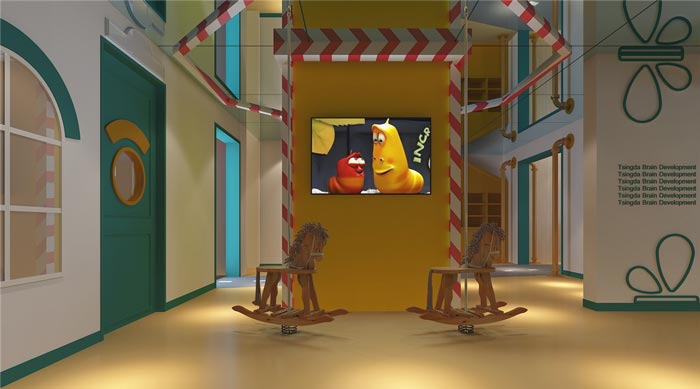 玩耍區(qū)域的設計:此處位于前臺空間的一側,目的就是希望讓孩子們第一眼看到就喜歡這里,孩子在玩耍的過程中會學到很多東西,這也正是客戶所期待的教學模式,玩具放置在空間之中讓孩子們可以快樂的玩耍,動畫片的放映與玩耍相互結合起來,就是希望讓孩子在玩耍中不斷學習。